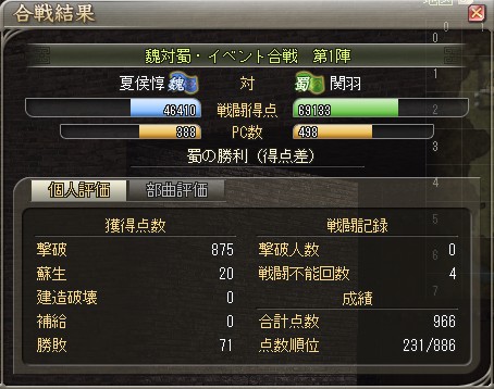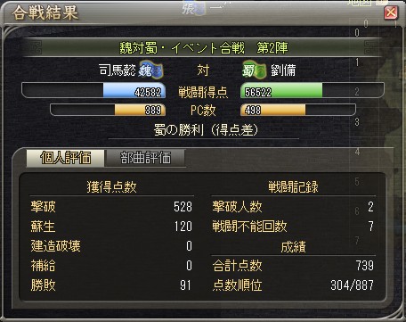 しかし、1ヵ月ぶり位の合戦参戦の為、感覚が取り戻せなくて悪戦苦闘してしまいました・・・orz