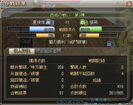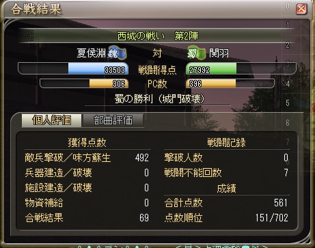 というわけで、三国制覇最終戦 魏 VS 蜀の結果はコチラ。